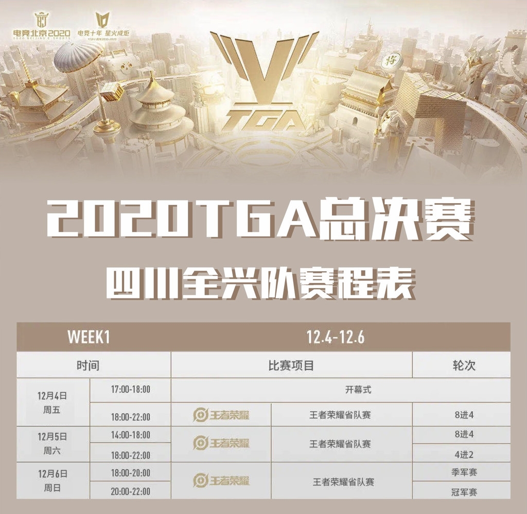12月6日晚八点,TGA总决赛冠军赛王者荣耀省队赛将在北京上演。决赛的另一支队伍将在北京XYG和江苏KSSC之间诞生,四川全兴队将在决赛对阵两队中的胜者,向冠军席位发起冲击。