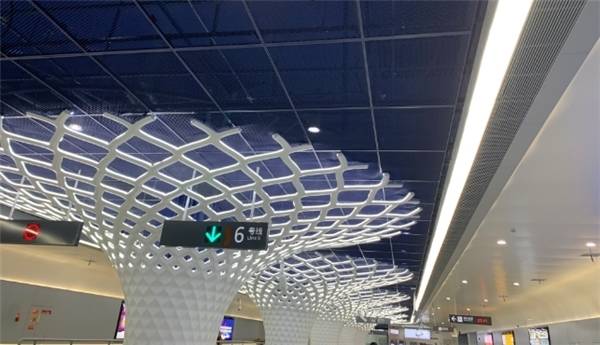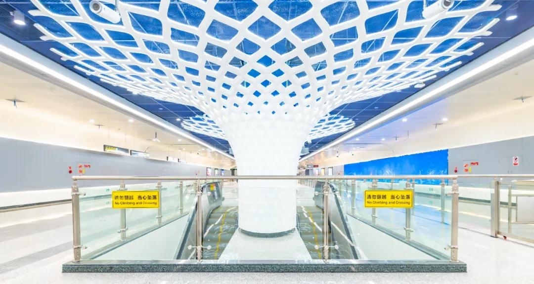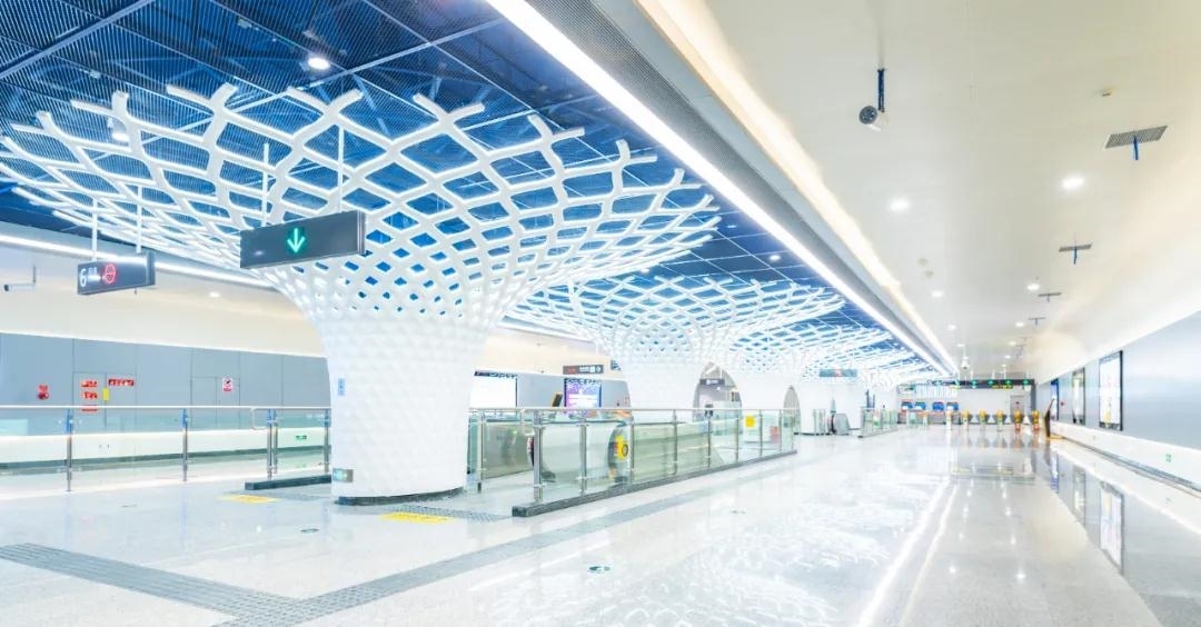 福田高架站外立面整体以前卫的航空器造型,辅以极具速度感的条窗呈现一幅翱翔腾飞的姿态,预示着空港新区繁荣发展的美好愿景。