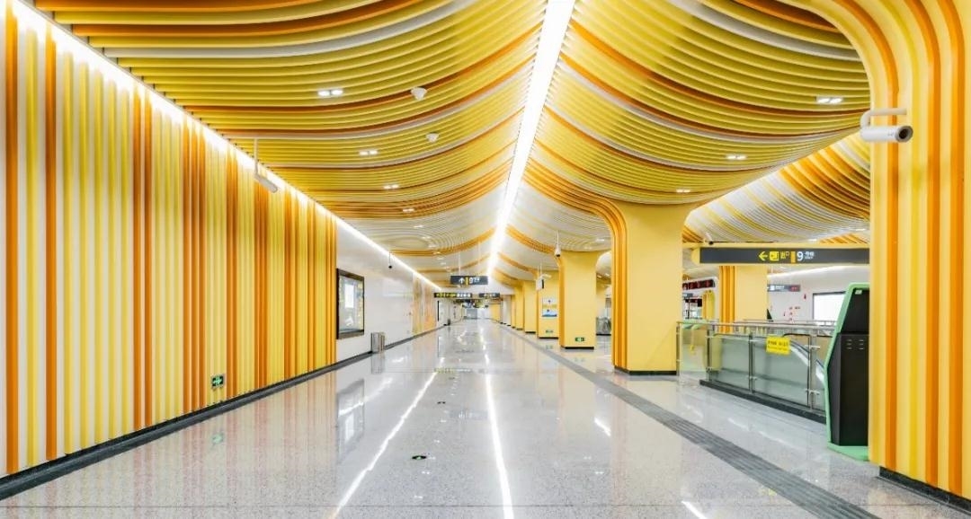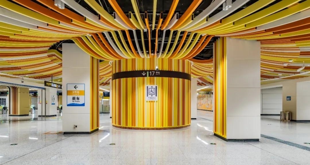 在9号线和17号线的换乘车站机投桥站,“蜀锦”成为贯穿始终的主题。以“织锦文化”为设计主题的设计特色浓郁。以织锦垂挂的自然形态为造型元素,搭配织锦的华丽色彩,模拟蜀锦织造基地织布垂挂的场景,将织造的美感大胆与传统建筑进行拼接,形成独特的时空对话,体现了“蜀锦历史名镇”的风采,展现了锦绣芳华的工艺之美。