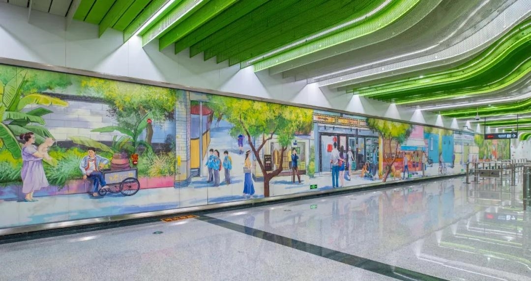 记者一行首先来到秦皇寺站,这里以“科技创新·互联共享”为主题,将抽象的“互联网”、具象的“川西竹编”两种元素相融合,体现科技与传统的交织,传达出互联网共享与文化传承欣欣向荣的发展意向。