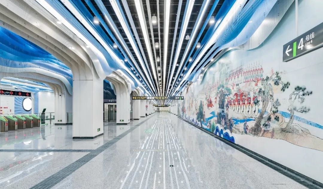 机投桥站是9号线和17号线的换乘站,车站以“花楼织锦”作为设计理念,通过模仿蜀锦的艺术手法,将织造的美感与传统建筑进行拼接,站内艺术品展现了从采桑、到养蚕抽丝、再到布匹完成,展现了蜀锦制作的整个过程。