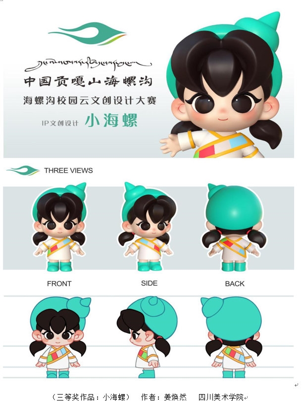 记者了解到,本次海螺沟校园云文创大赛自面向全国高校招募以来,参赛选手分别来自四川美术学院、清华大学、四川民族学院、西华大学、四川传媒学院、电子科技大学成都学院、长江师范学院、重庆工程学院、四川师范大学等高校一百多名学子,共收到参赛作品数百件。这些作品种类丰富,包括公仔IP设计、插画设计、工艺品设计等,衍生产品设计包括潮玩摆件、丝巾、抱枕、餐具、家居装饰画、手机壳、文具、配饰等。经过专业评审团的综合评选,最终评选出一等奖1名,二等奖2名,三等奖3名,入围奖18名。其中来自四川美术学院的杜卓珊、艾成的团队合作作品获得了本次大赛一等奖。
