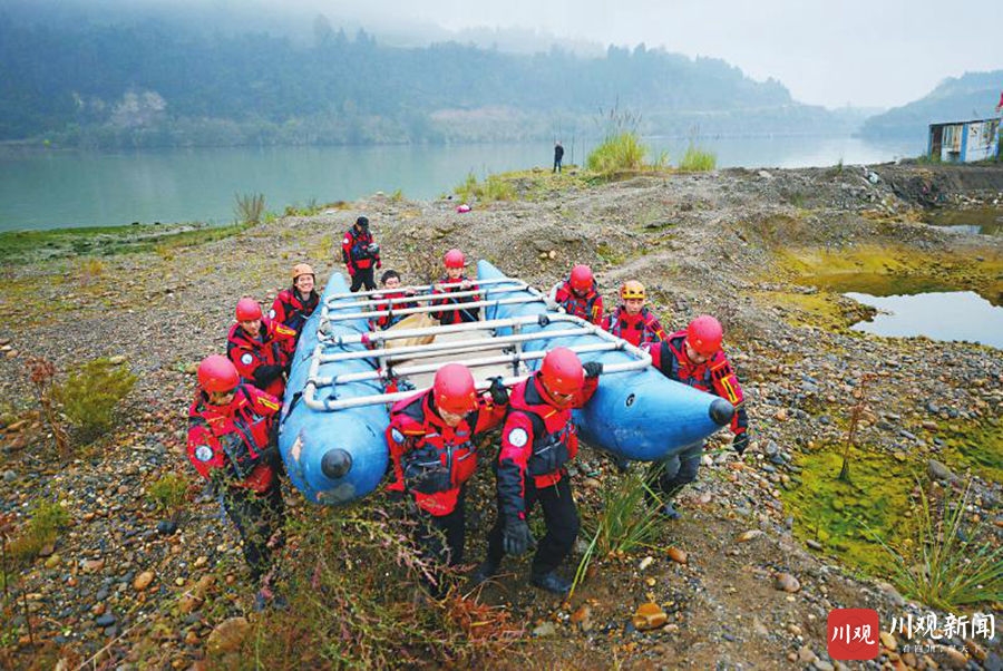 10月29日,在嘉陵江阆中境内,队员们扛着双桨船上岸。