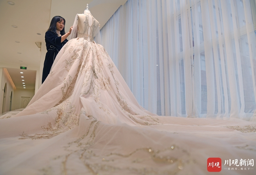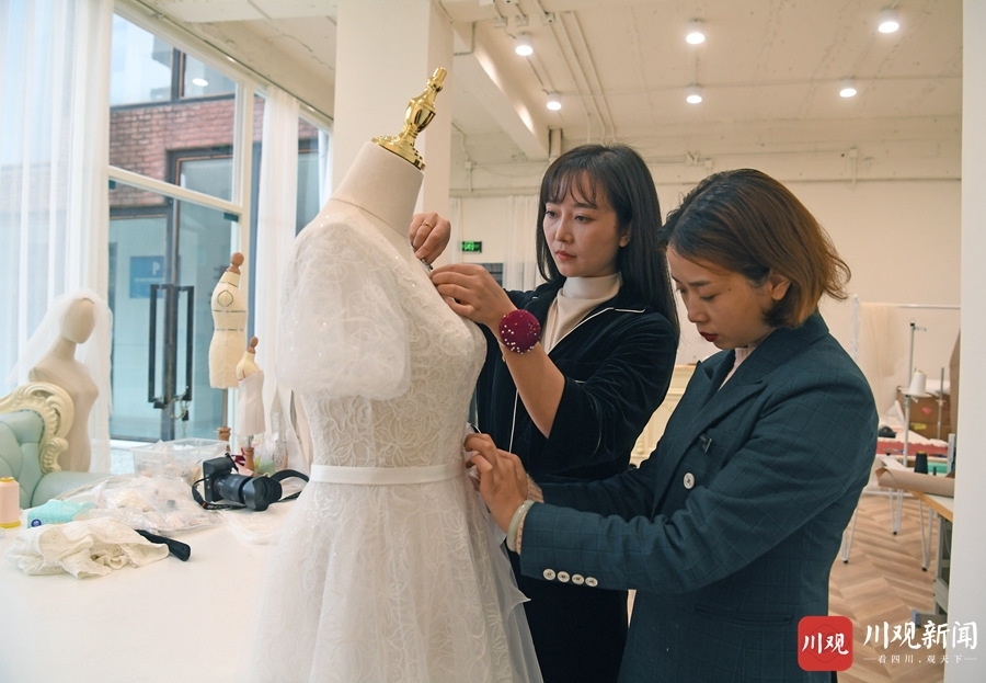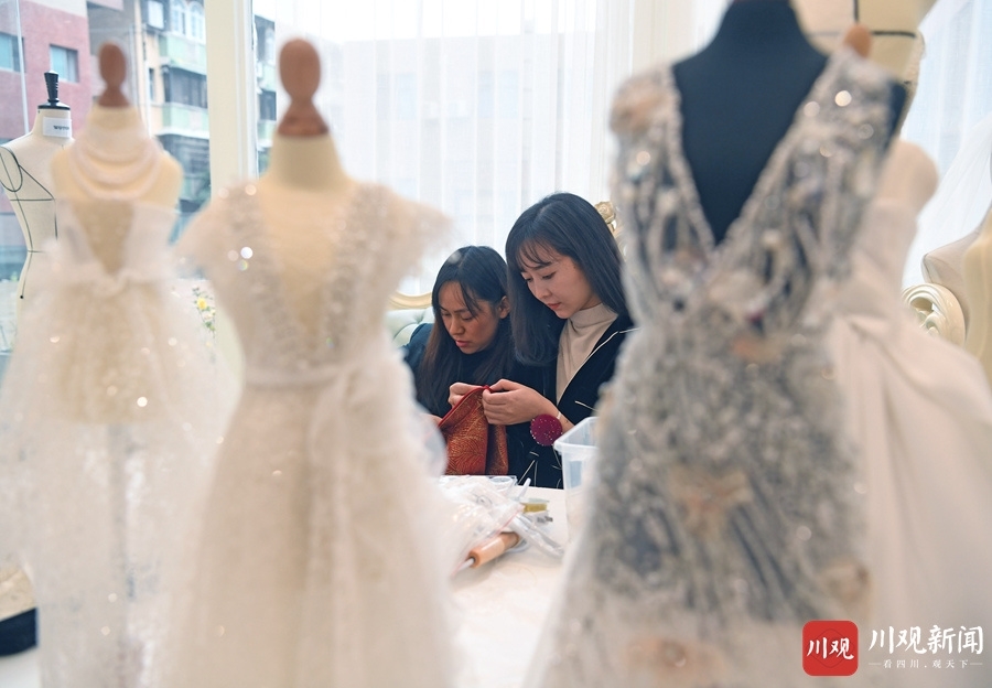 12月8日,德阳市旌阳区T39创意园内,婚纱设计师钟丽在她的工作间,通过法式刺绣创作着一朵立体感很强的花朵,它将被设计在一套高端定制婚纱上。