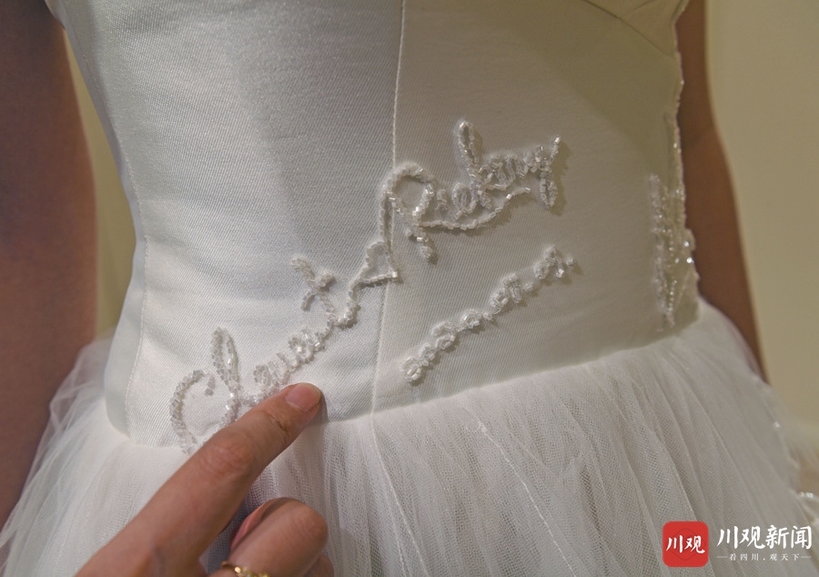 这套婚纱上,钟丽通过法式刺绣的方式设计了新人的姓名。