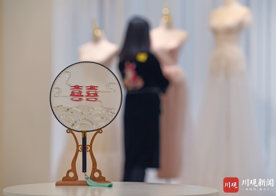 钟丽已逐步将法式刺绣移植到高端婚礼文创品上,这把扇子就是其中之一。