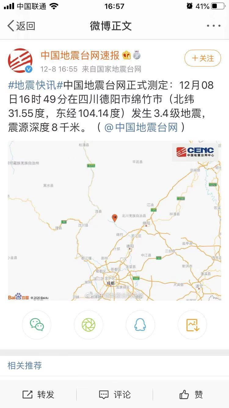 绵竹市发生3.4级地震 震源深度8千米