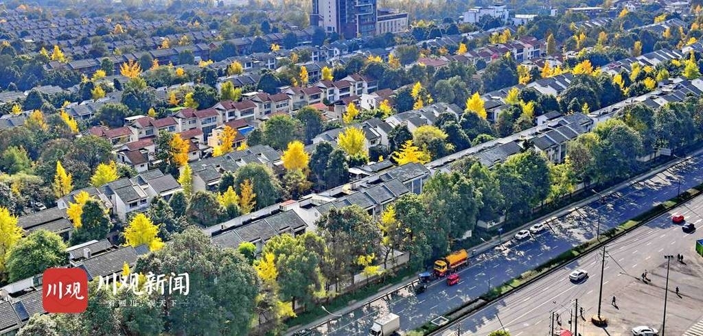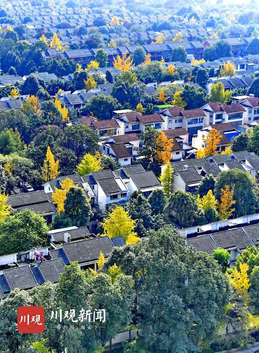 12月8日下午,成都多日的阴雨天气突然放晴,在位于成都高新区中和街道一小区内,金灿灿的银杏树迎着冬日暖阳,在深蓝色和朱红色瓦片的衬托下,犹如一幅油画风景。