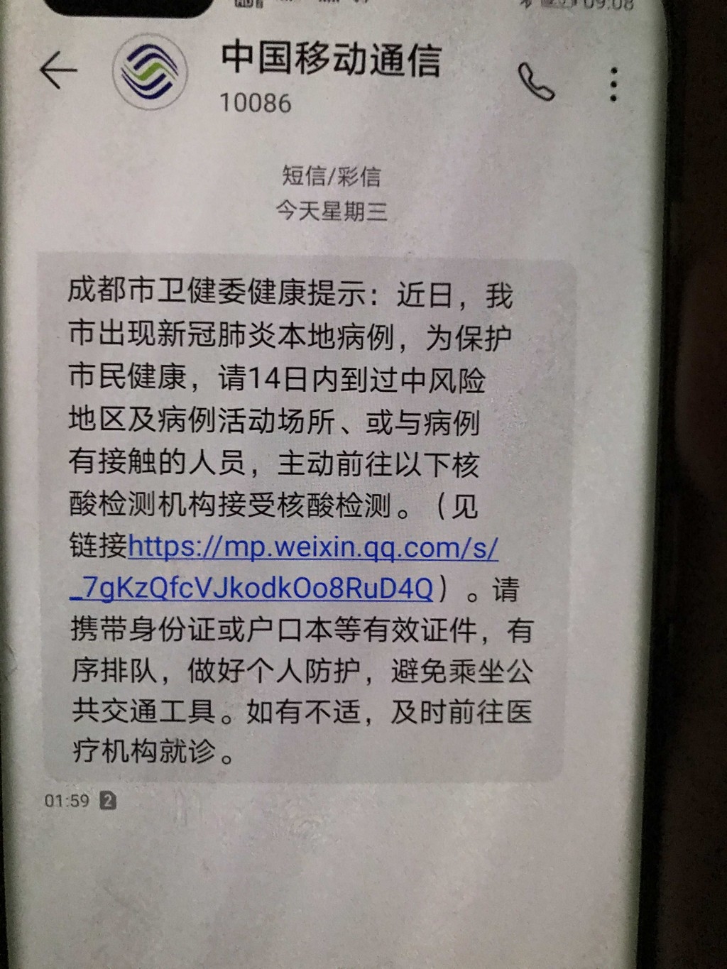 12月9日凌晨起,多名成都市民陆续收到了成都市卫健委发送的健康提示短信,号召14日内到过中风险地区及病例活动场所、或与病例有接触的人员,主动前往以下核酸检测机构接受核酸检测。