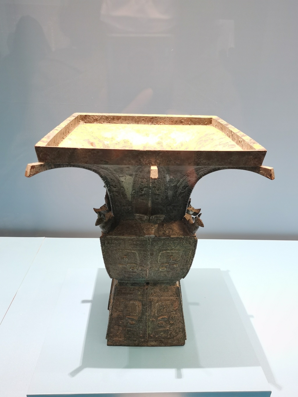 这次展出的“戌马”铜觚,来自国家博物馆,内壁铸有“戌马”两个铭文,这是表明器物的所有者家族的徽号。魏子淇说,觚可以盛酒,但因为口太大,一般不用来饮酒。商代的贵族一般用柶(一种勺子)将觚内的酒舀到更小的杯子里饮用。