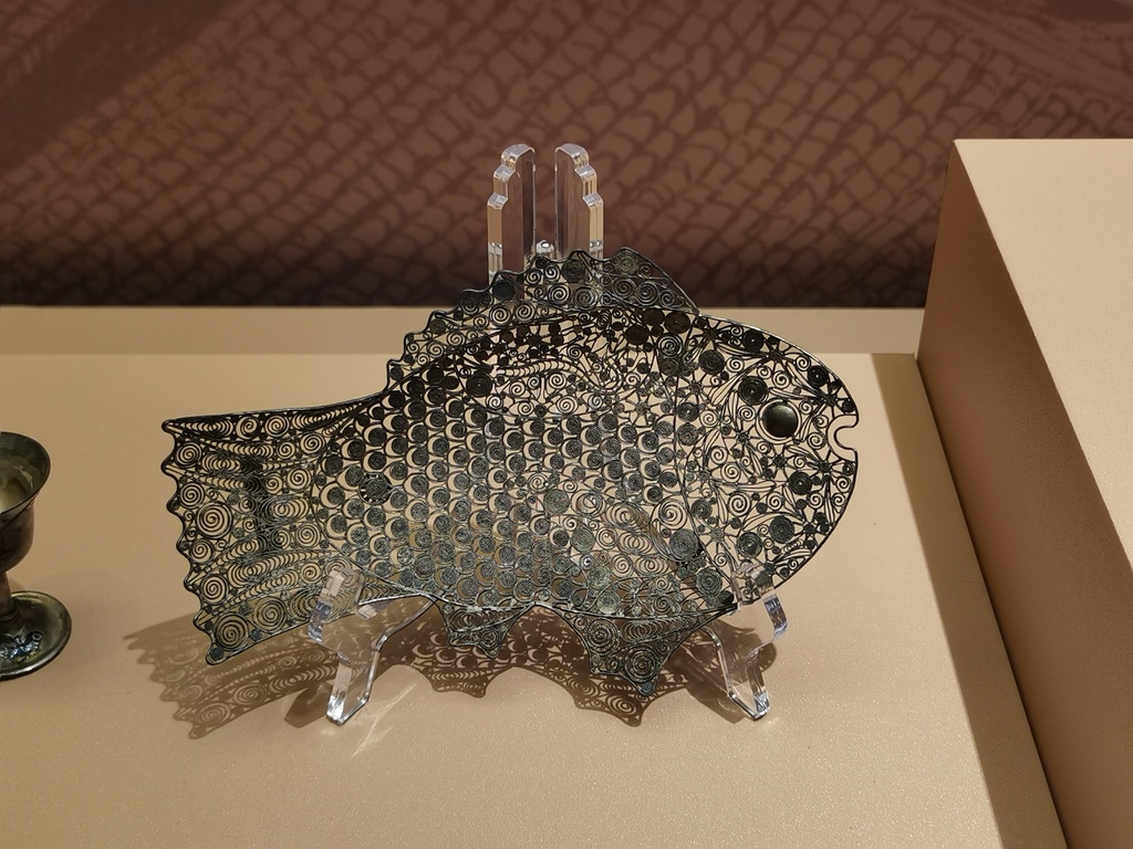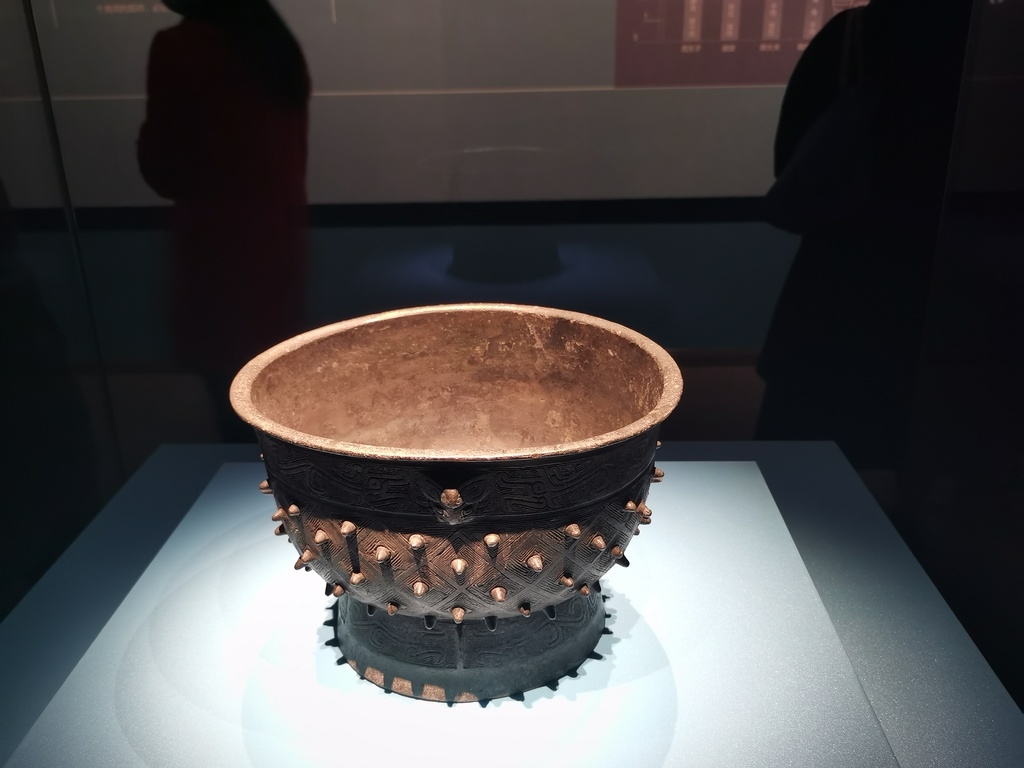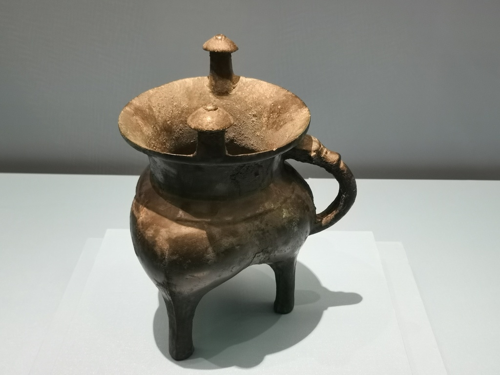 此次展览上,有一件来自国家博物馆的窃曲纹龙首三足铜盉,年代为西周,果然延袭了商代的敦厚凝重之感。