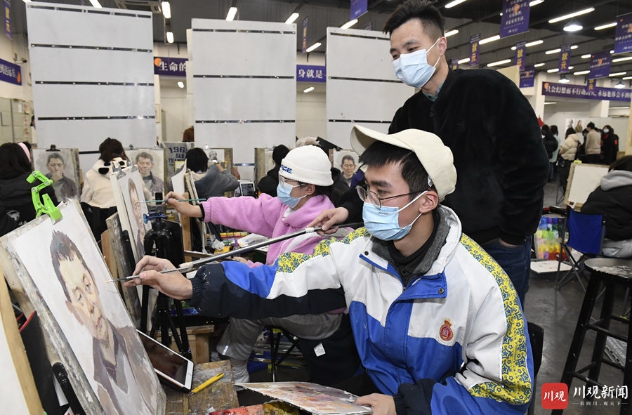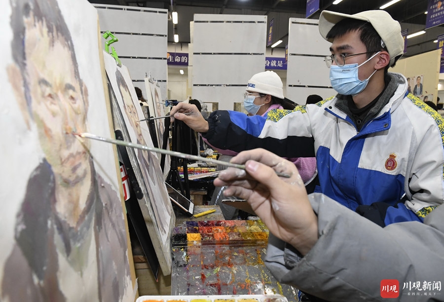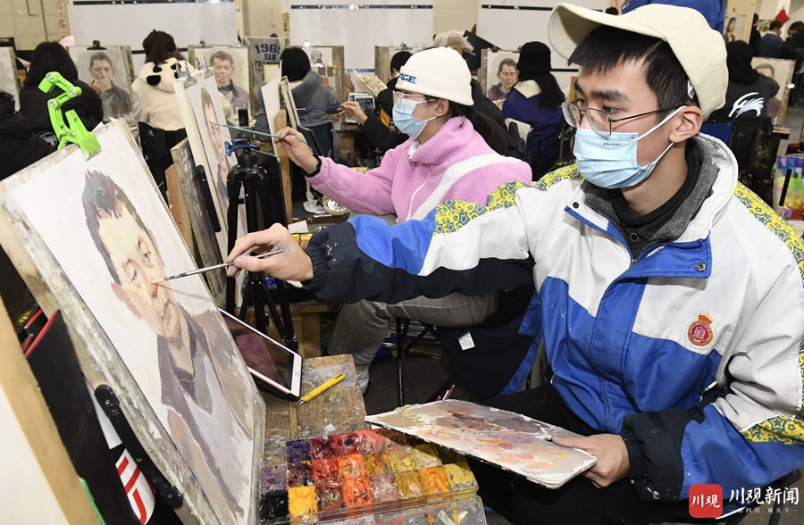 2020年12月9日,成都市中和中学的高三学生在画室里挥动着手中的画笔,认真备考。为应对美术院校专业招生考试,成都市中和中学的美术考生加班加点进行最后冲刺,力争能在专业考试中取得优异成绩。