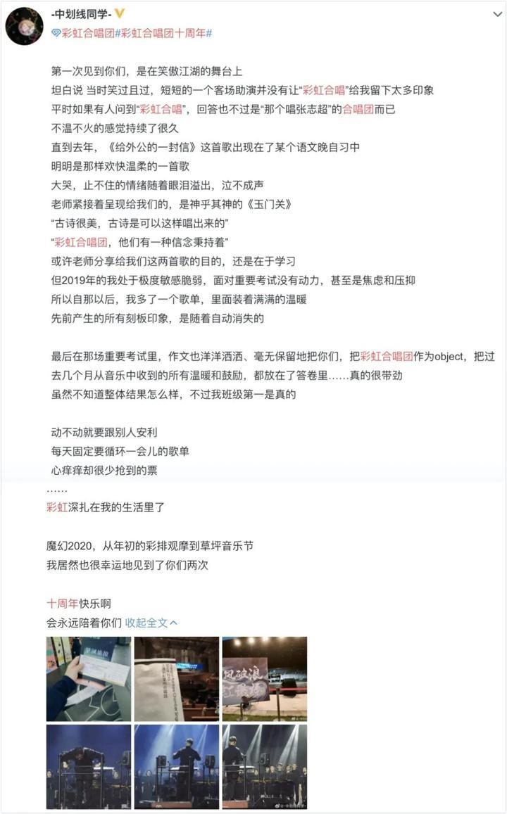 在微博上有一个话题#彩虹合唱团十周年#,不要随便点进去,因为你很可能会不自觉加入小作文PK,转身又收获满满一筐的感动……