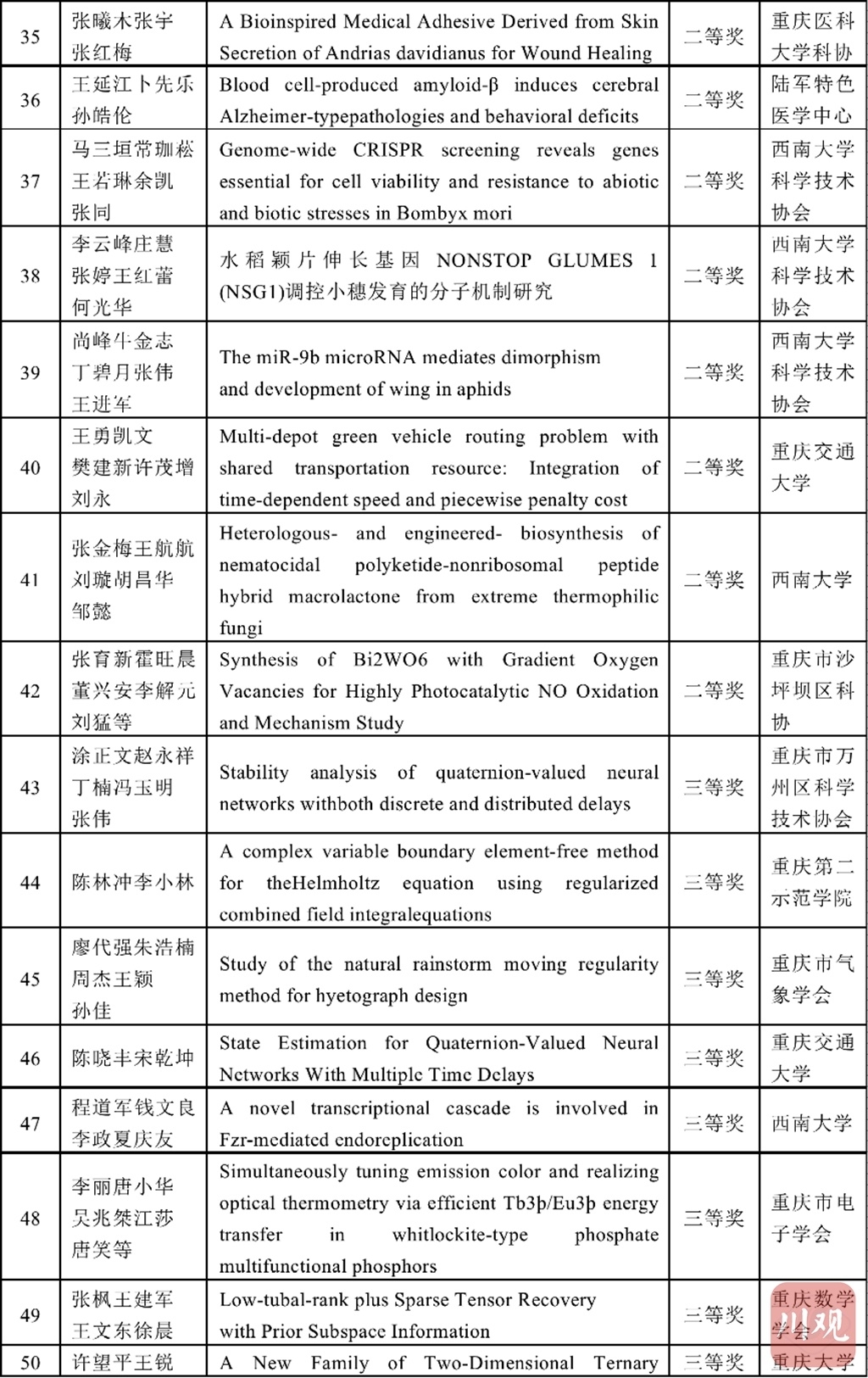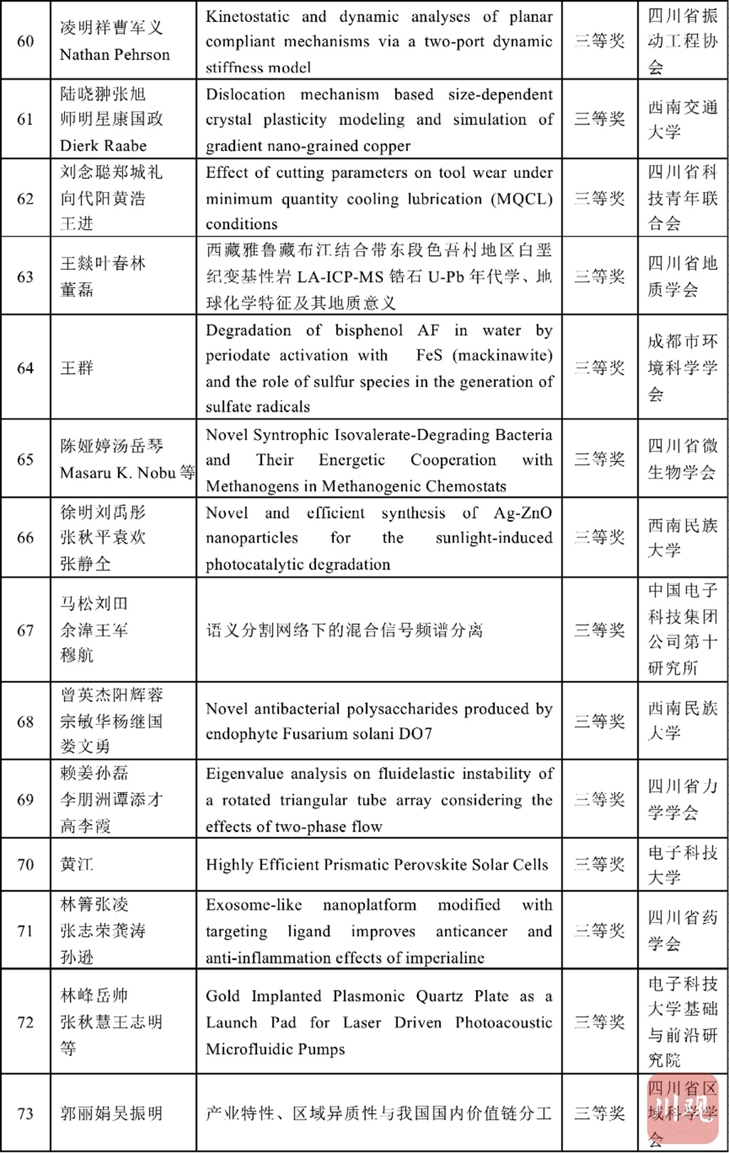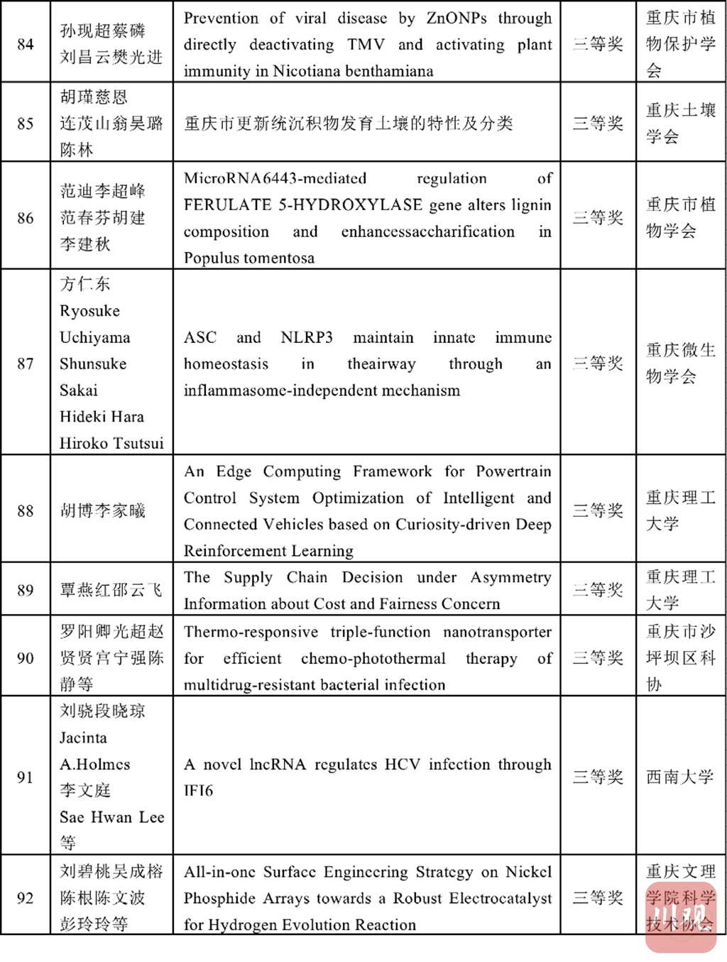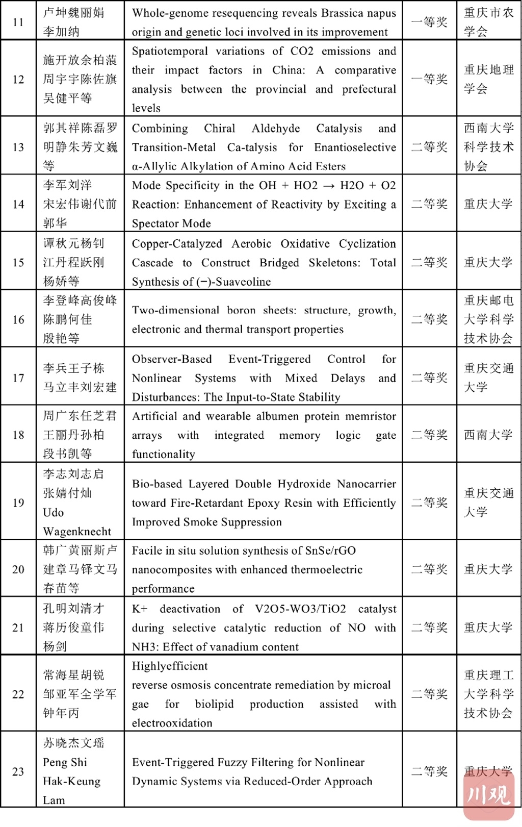 四川省科协和重庆市科协学术与学会专委会分别组建专家评审委员会,按照理、工、农、医、交叉学科分类对推荐的优秀论文进行评审,共评选出了优秀论文184篇,其中获特等奖4篇、一等奖20篇、二等奖60篇、三等奖100篇。