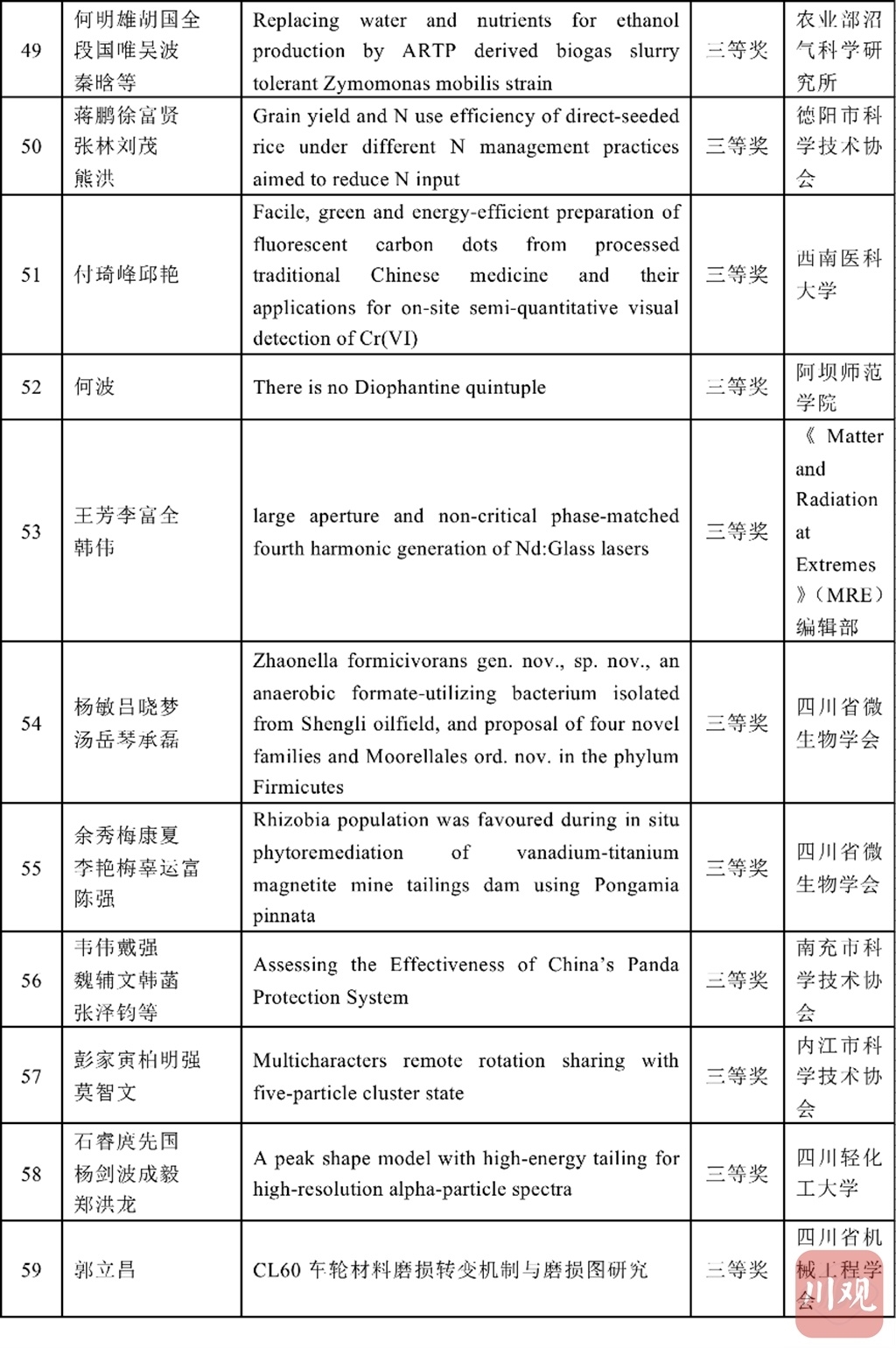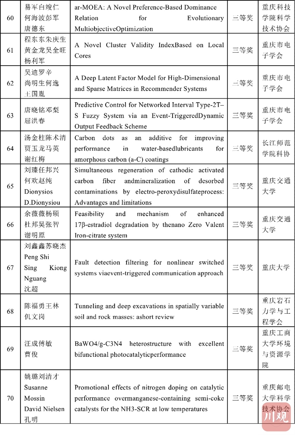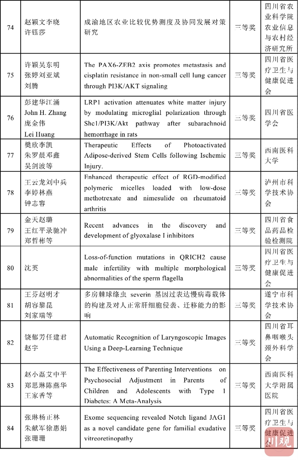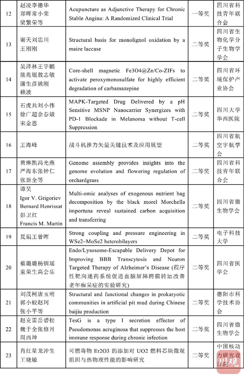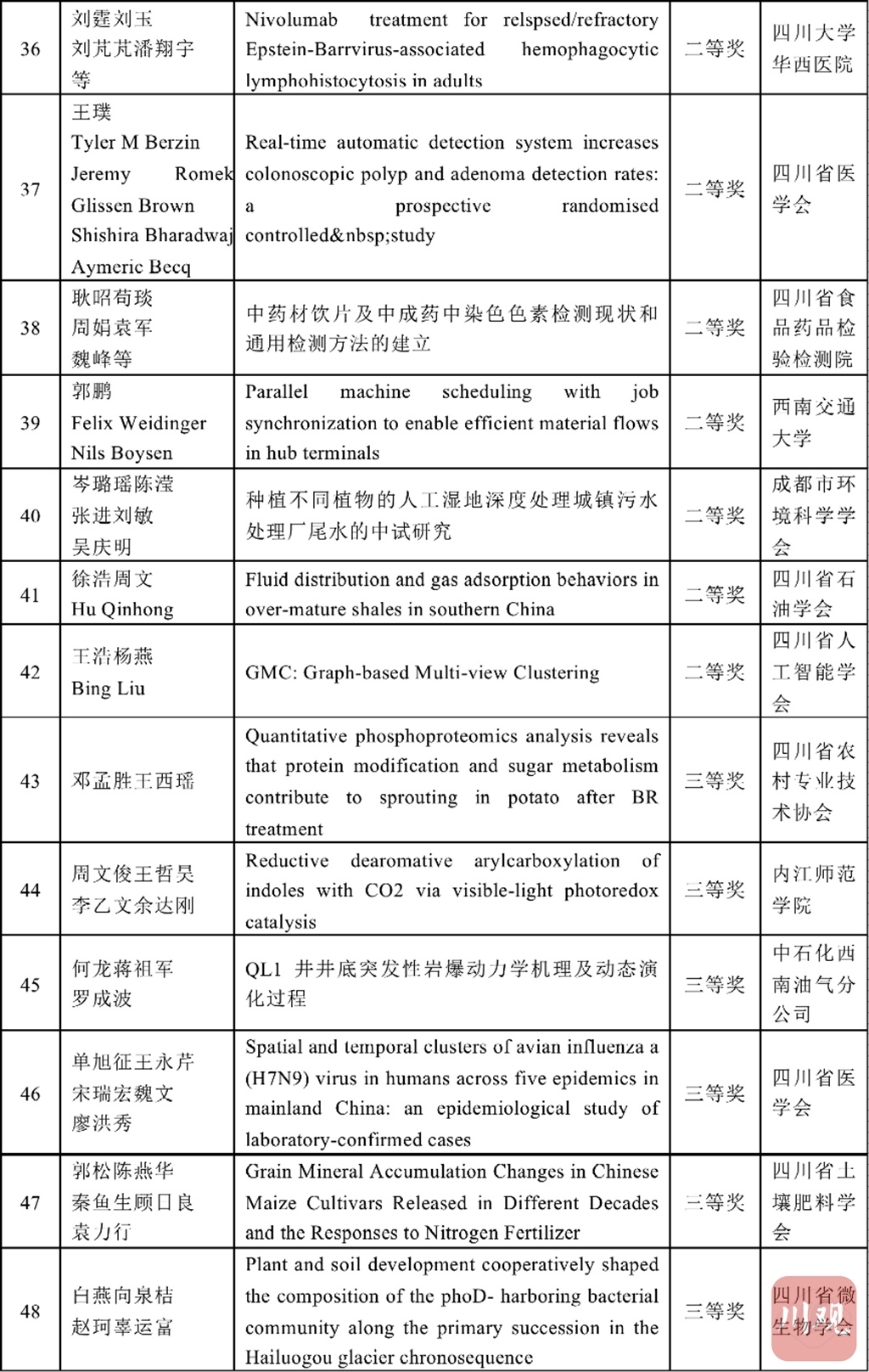 四川省科协和重庆市科协学术与学会专委会分别组建专家评审委员会,按照理、工、农、医、交叉学科分类对推荐的优秀论文进行评审,共评选出了优秀论文184篇,其中获特等奖4篇、一等奖20篇、二等奖60篇、三等奖100篇。