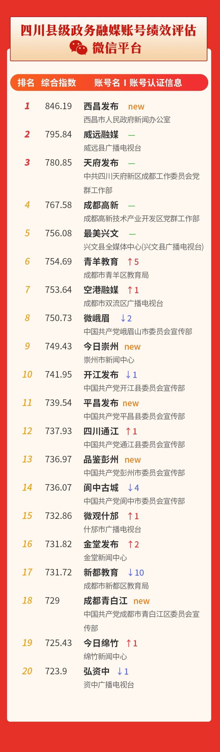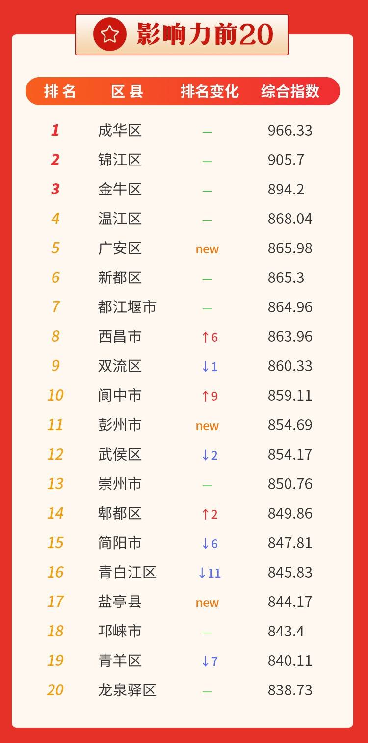 从影响力前20名统计结果看,成都市成华区蝉联第一,广安市广安区新晋入围即冲至第5名;南充市阆中市、凉山州西昌市排名上升幅度较大。