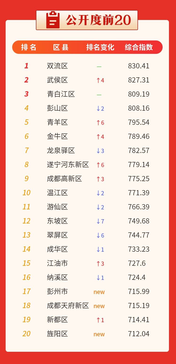 从公开度前20名统计结果看,成都市双流区蝉联第一,成都市武侯区、成都市青白江区、眉山市彭山区、成都市青羊区名列前五。成都市青羊区、遂宁河东新区排名上升幅度较大。