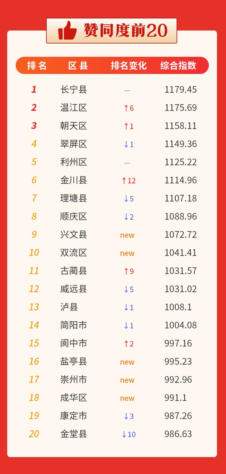 从赞同度前20名统计结果看,宜宾市长宁县蝉联第一,成都市温江区、广元市朝天区、宜宾市翠屏区、广元市利州区名列前五。阿坝州金川县表现亮眼,从上期第18名升至本期第6名。