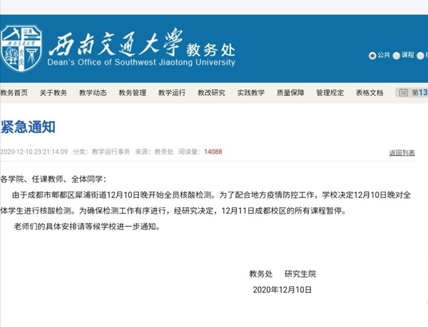 12月11日,记者从西南交通大学获悉,为配合地方疫情防控工作,该校于昨日晚开始对学生全员进行核酸检测,老师的具体安排将进一步通知。