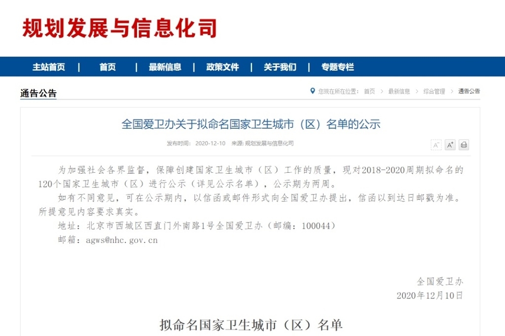 12月11日,记者从国家国家卫生健康委员官网获悉,为加强社会各界监督,保障创建国家卫生城市(区)工作的质量,现对2018-2020周期拟命名的120个国家卫生城市(区)进行公示(详见公示名单),公示期为两周。其中,为加强社会各界监督,保障创建国家卫生城市(区)工作的质量,现对2018-2020周期拟命名的120个国家卫生城市(区)进行公示(详见公示名单),公示期为两周。其中,四川13个城市在列↓