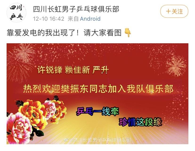 而随着联赛宣布重启,各俱乐部开始进行补强。终于,四川俱乐部宣布樊振东将代表球队征战,并在官网上晒出了欢迎樊振东加入的海报,“乒乓一线牵,珍惜这段缘”8个字也让球迷很欣慰,“欢迎’熊猫’回家”、“川队雄起!”球迷们纷纷留言,从字里行间可见他们对于新赛季又能看到世界第一在赛场征战的期待。