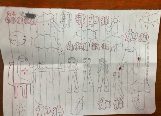 医护人员们现场收获了学生们制作的感谢小卡片、手写小纸条,上面写着“谢谢你们,白衣天使!”“郫都加油,为你们敬礼!”“感谢你们在前线为我们奋斗,祝你们安全归来。”