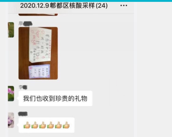 在网上流传的截图中,记者看到,金牛区中医医院医护人员还在微信群里互相晒感动,“这是我们收到的珍贵礼物。”
