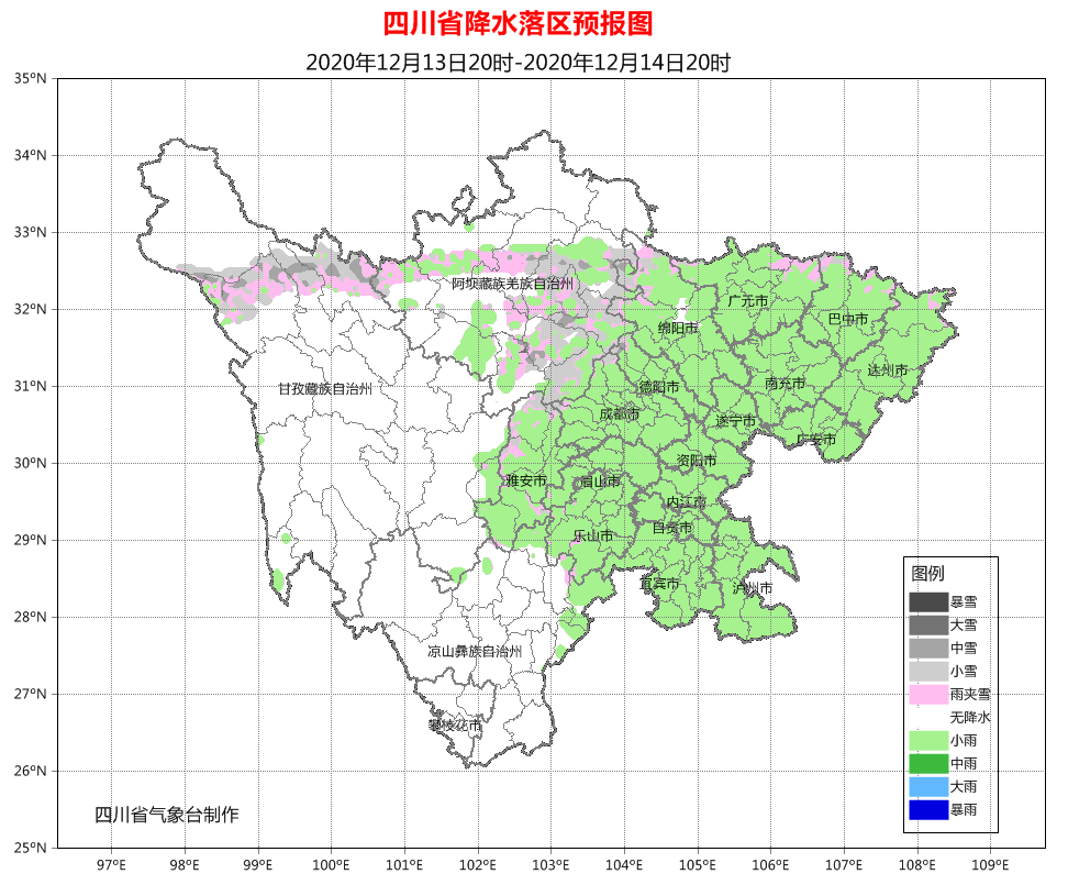 13日晚上到14日白天,盆地各市阴天有小雨,盆周山区有雨夹雪或小雪;甘孜州北部和阿坝州阴天间多云有分散阵雪(雨),局部地方中雪,川西高原其余地方和攀西地区多云间晴。
