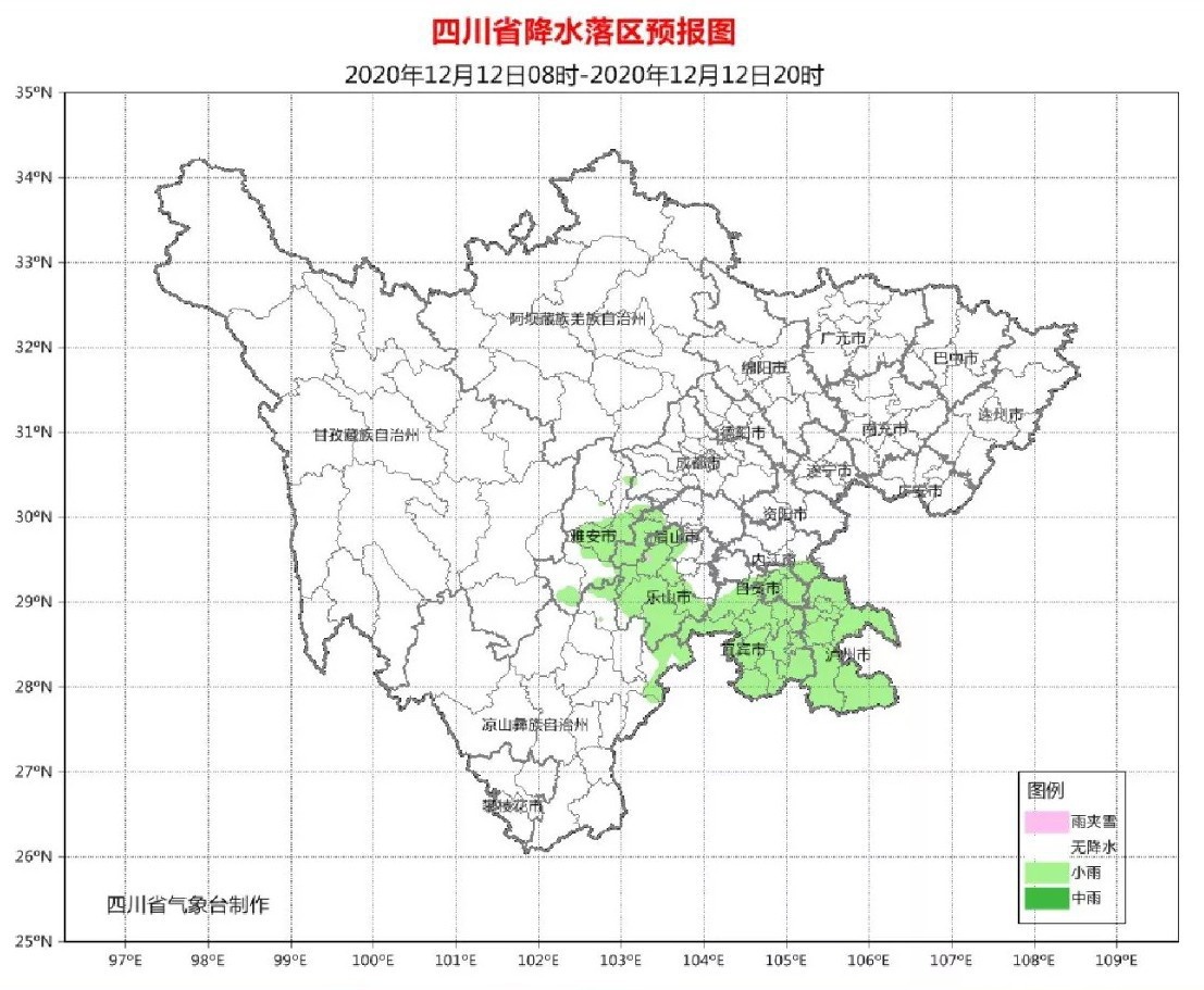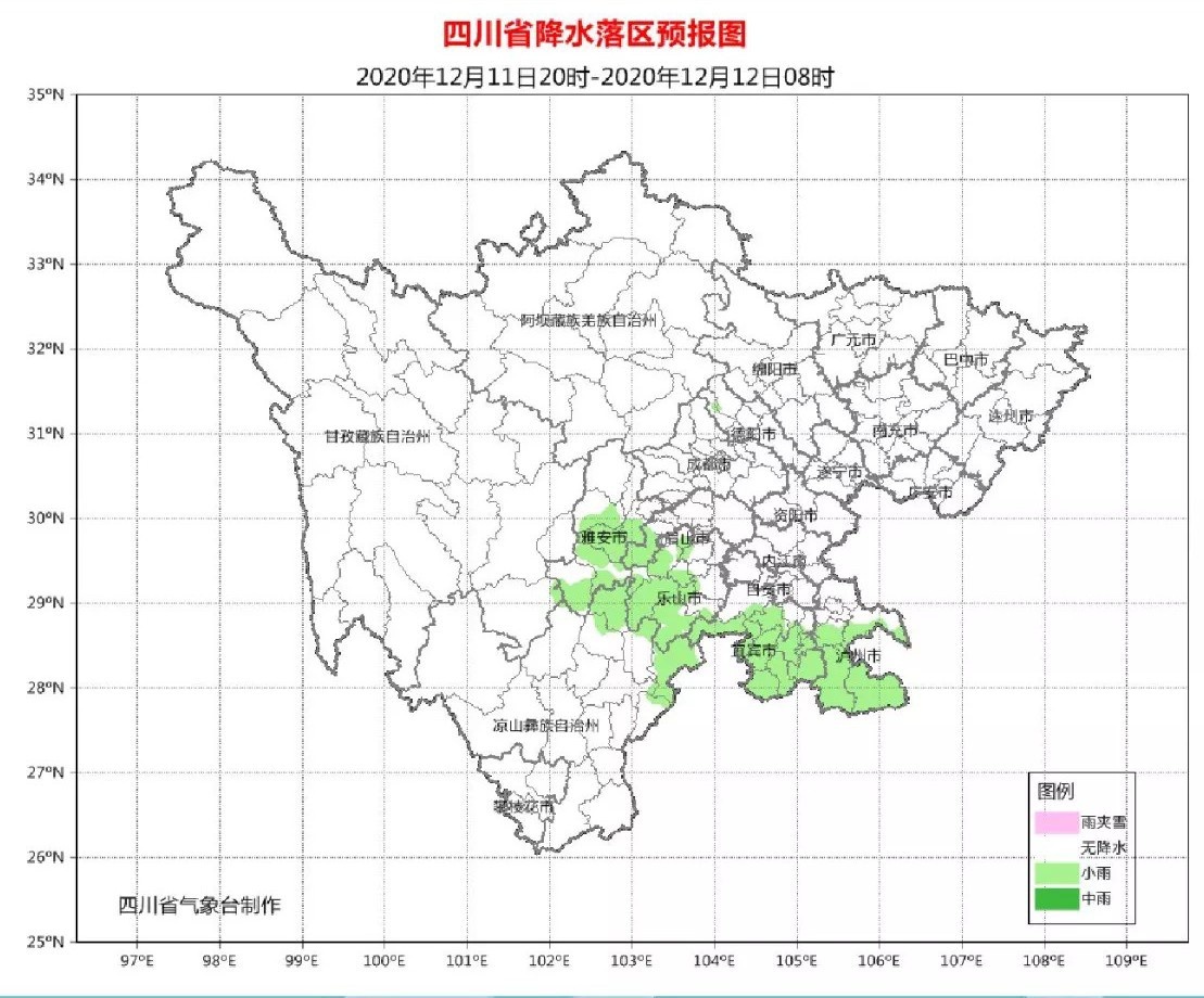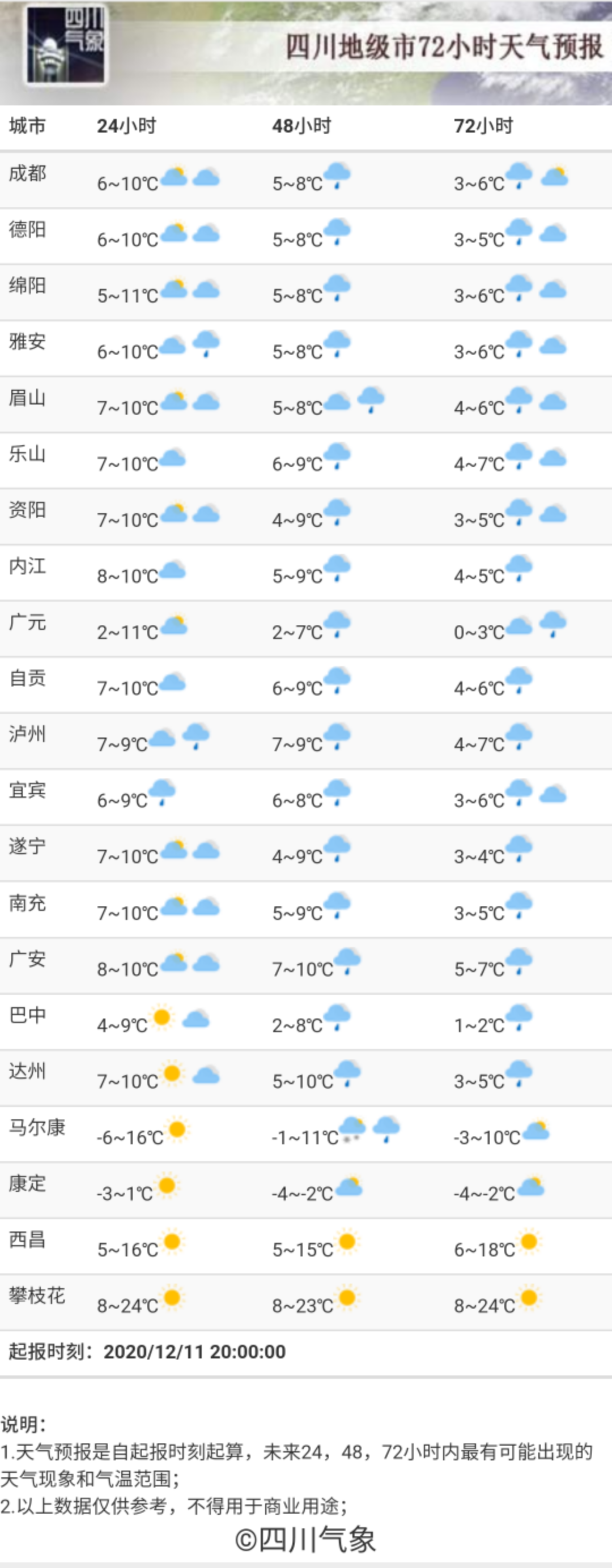 今天(12月11日)晚上到明天白天,宜宾、泸州、乐山、雅安、眉山、自贡6市的部分地方阴天,早晚有小雨或零星小雨,盆地其余地方阴天间多云;川西高原和攀西地区晴间多云。24小时内,盆地最低气温:西北部2-5℃,其余地方6-8℃;最高气温:10-12℃。