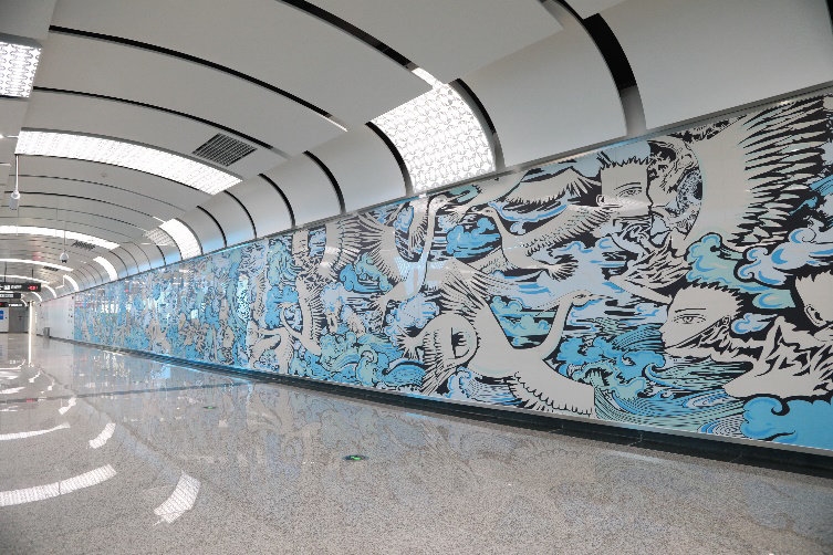 川大江安校区站以“风华正茂”为设计主题,将展开的“书本”作为空间延展的主体装饰构造,“书页”片状的组合形式活泼、清逸,通过冰蓝色灯光的渲染,形象的展现川大新校区现代、朝气的精神风貌和活力。站内雕刻了学校艺术学院副教授熊宇创作的“风华正茂”大型陶瓷壁画作品,反映了川大师生蓬勃向上的朝气活力。(图片由四川大学提供)