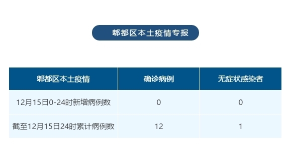 12月16日,记者从成都市卫健委获悉,12月15日,成都市无新增新冠肺炎确诊病例。无新增无症状感染者,1名境外输入无症状感染者解除集中隔离。