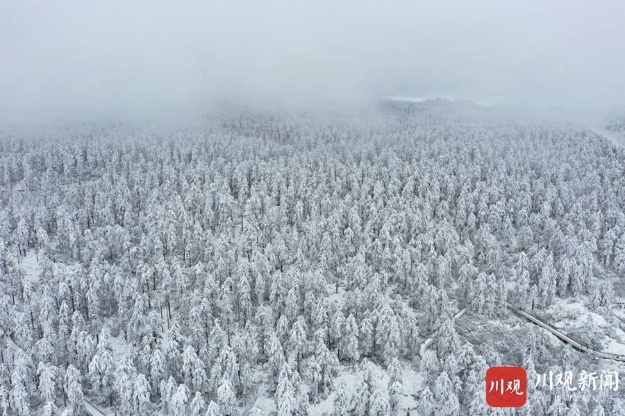 2020年12月16日,俯瞰四川省眉山市洪雅县瓦屋山,银装素裹大美如画。进入冬季,瓦屋山成为南国冰雪休闲旅游的好去处。