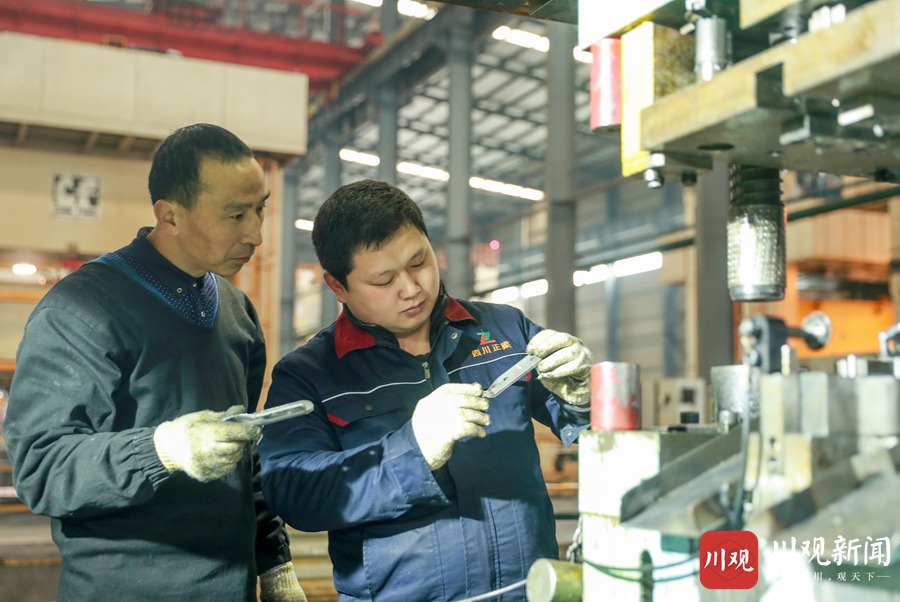 华蓥市冬闲的农民在家门口的机械加工厂查看产品工艺。