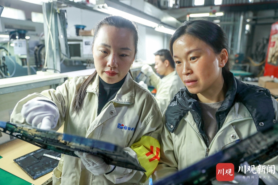 华蓥市冬闲的农民在家门口的电子配件厂查看产品工艺。
