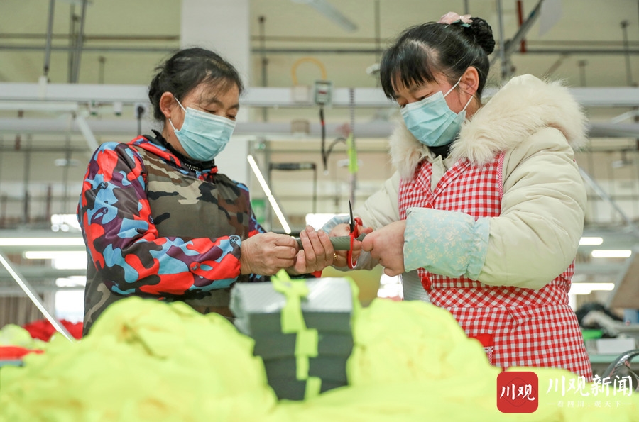 华蓥市冬闲的农民在家门口的服装厂缝纫供应春节市场的服装。