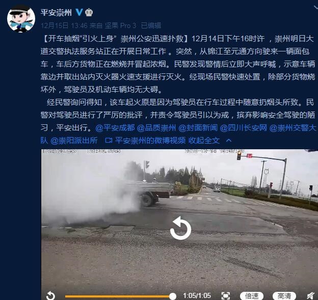 “面包车,你车后的货物着火了,马上停车…”12月16日,记者从崇州市公安局交通警察大队获悉,近日,该大队民警成功处置了乱丢烟头导致的货物燃烧的事件。所幸,除部分货物烧坏外,驾驶员及机动车辆均无大碍。