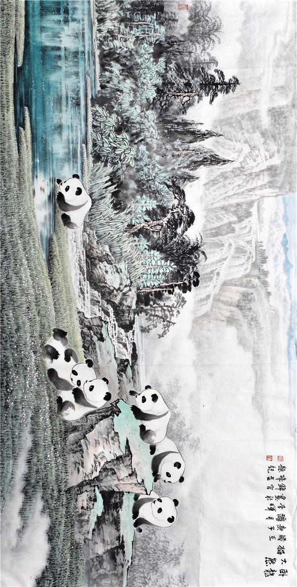 因此,在画中,天边最远处有冲破云层的山峰,在翻滚的云海之下,又有不畏冷寒的松树,这是唯一能生存于那个海拔高度的乔木;随后,山势像台阶一样,一级级下来,终于来到水草丰茂的谷地。这里既有苍松翠柏、又有杜鹃报春,当然少不了大熊猫爱吃的竹子。