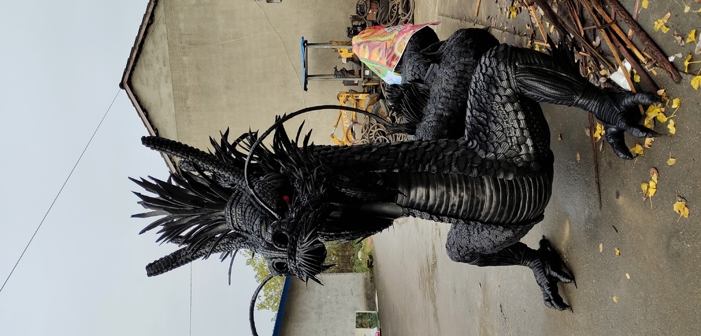 据邱春勇介绍,这条“巨龙”是由一千多条废旧自行车和小汽车轮胎进经过切割、上漆等工艺打造而成。在此之前,他们还通过变废为宝的形式打造过一匹高二米八,长三米的“巨马”。“废旧汽车还能卖钱,但废旧的自行车轮胎却几乎没有人回收,我们就想通过变废为宝资源再利用的形式减少这些东西对环境的污染。”邱春勇说。