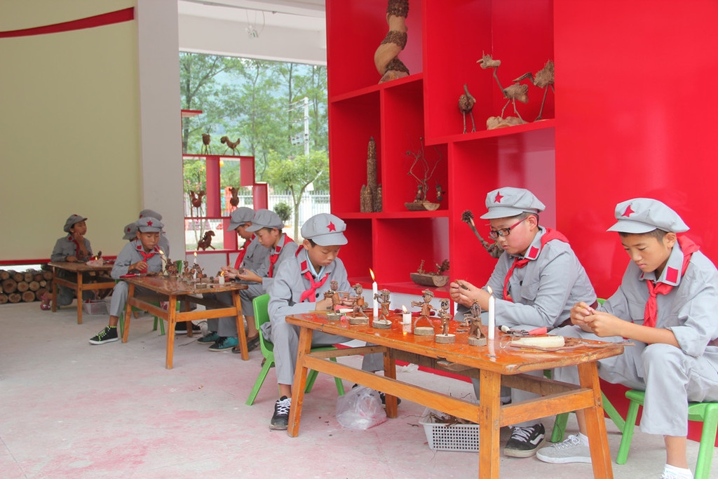 始建于1917年的邛崃市高何镇中心小学校是成都地区唯一的红军小学,尽管是一所只有125个学生,18名教师的乡村小学,但是它却通过红色教育和根果特色文化融合的教育传承,屡获殊荣。在学校综合楼外墙处竖立着学校校训“立根树人”,学校请老红军讲述抗战故事、组织师生“重走长征路”、开展“唱红歌”、“做红色小传人”活动……将红军精神有效融入了学校校训之中。漫步邛崃红军小学总校校园,根艺文化的馨香扑面而来……“利用天然的竹根,可以当成卷曲的头发,借助竹节的弧度,制成黄包车的顶棚,利用圆润的青冈果可以制作蚂蚁的身体。”学校从实际出发,发掘和利用山区独特资源竹木根,开展特色艺术教育活动,让学生在学中玩,玩中学,真切关注每一位学生,促进学生全面素质发展。