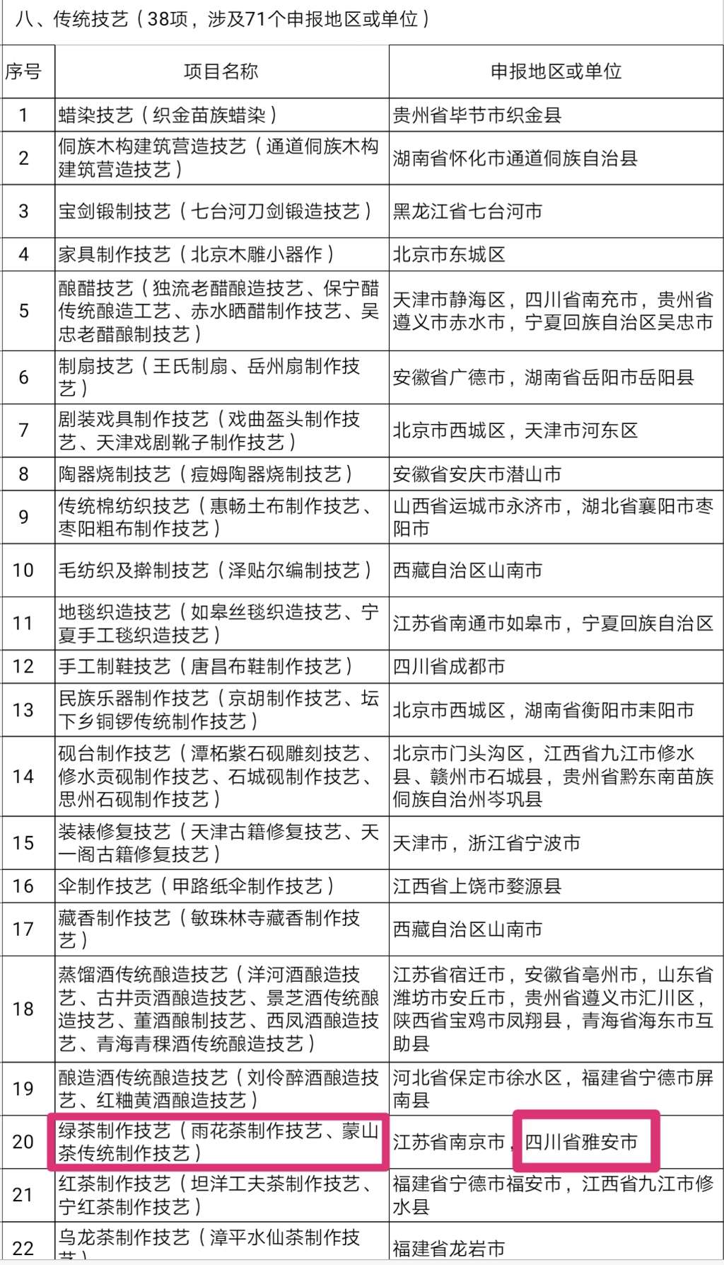 近日,文化和旅游部发布了关于第五批国家级非物质文化遗产代表性项目名录推荐项目名单的公示,新列入198项,扩展139项。其中,四川省雅安市蒙山茶传统制作技艺榜上有名。