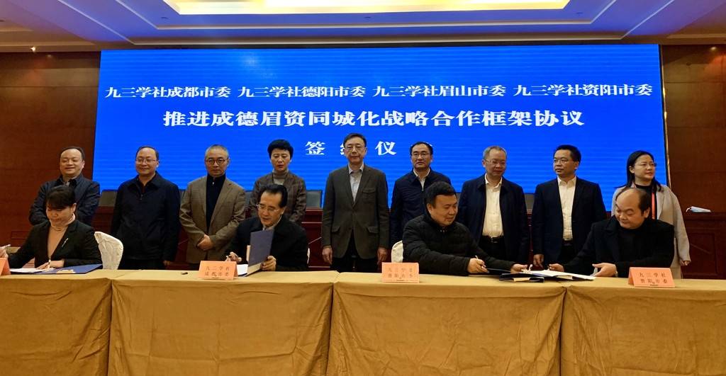 12月20日,成德眉资九三学社组织发展战略合作协议签约仪式在成都市绿洲大酒店隆重举行。签约仪式上,九三学社四川省委员会副主委、九三学社德阳市委员会主委、九三学社眉山市委员会主委、九三学社资阳市委员会主委、共同签署《成德眉资同城化战略合作框架协议》。签约仪式由九三学社四川省委员会专职副主委主持。