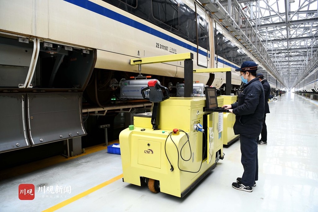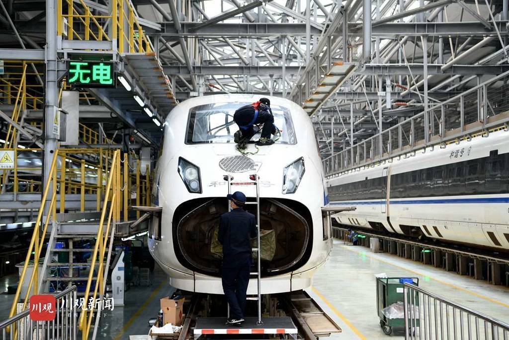 随着2021年元旦小长假的日益临近,中国铁路成都局集团有限公司成都动车段组织技术人员对配属的145组各型号高铁动车组进行记名式“体检”, 全面保障高铁动车组运行质量,确保旅客元旦小长假期间乘坐高铁动车组安全平稳健康出行。图1为12月22日,成都动车段“动车医生”正在对高铁动车组车底进行检修。