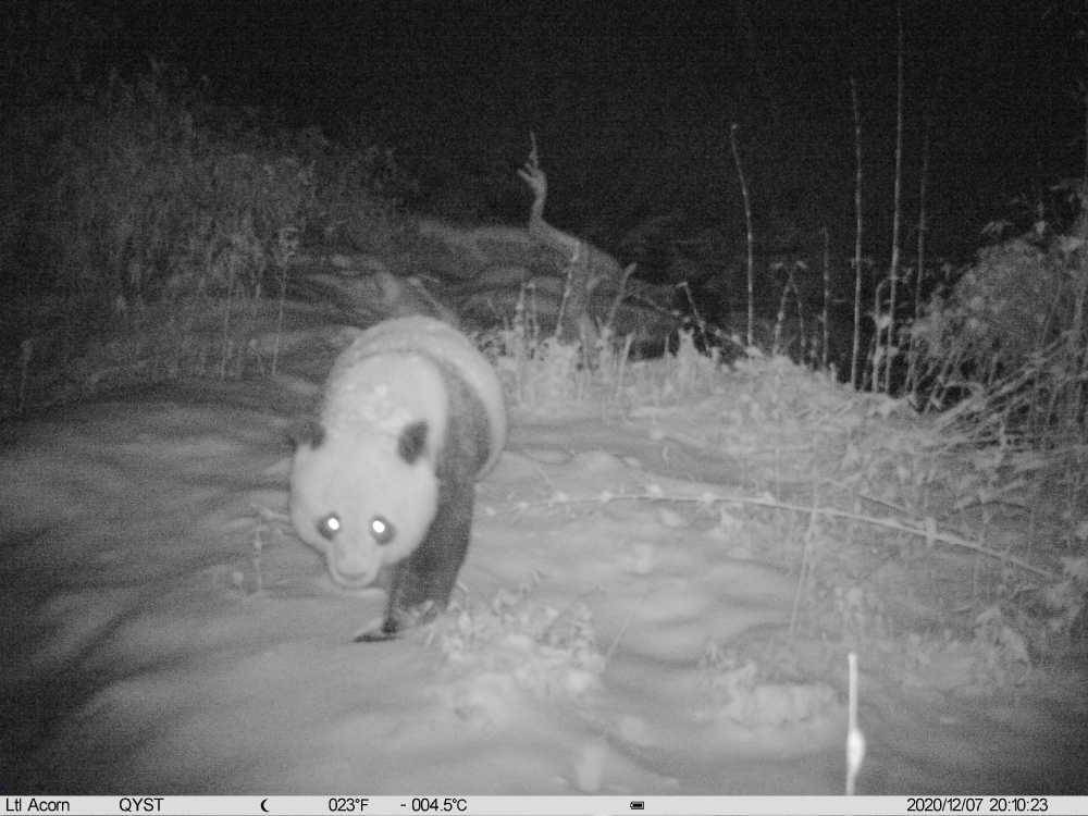 3天之后的12月7日20点10分,距离上一次拍摄点位约1公里之外的四角湾主沟的河边,再次拍摄到一只憨态可掬的大熊猫阔步走来。工作人员介绍,由于平均每只大熊猫活动范围为10.82平方公里,因此两处点位拍摄的大熊猫可能是同一只。