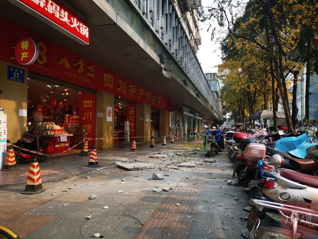 记者在现场看到,目前城管部门已经在事故现场拉起了警戒线,禁止行人通行。从警戒线外可以看到,掉落的墙体将二楼火锅店的临街一处屋面砸穿,掉落下来的墙体至楼下人行道部分地面破损。“还好今天客人不多,窗台位置没有客人。”火锅店一位负责人告诉记者,为了安全起见,火锅店计划暂停营业,待危险排除后再营业。