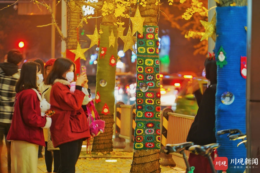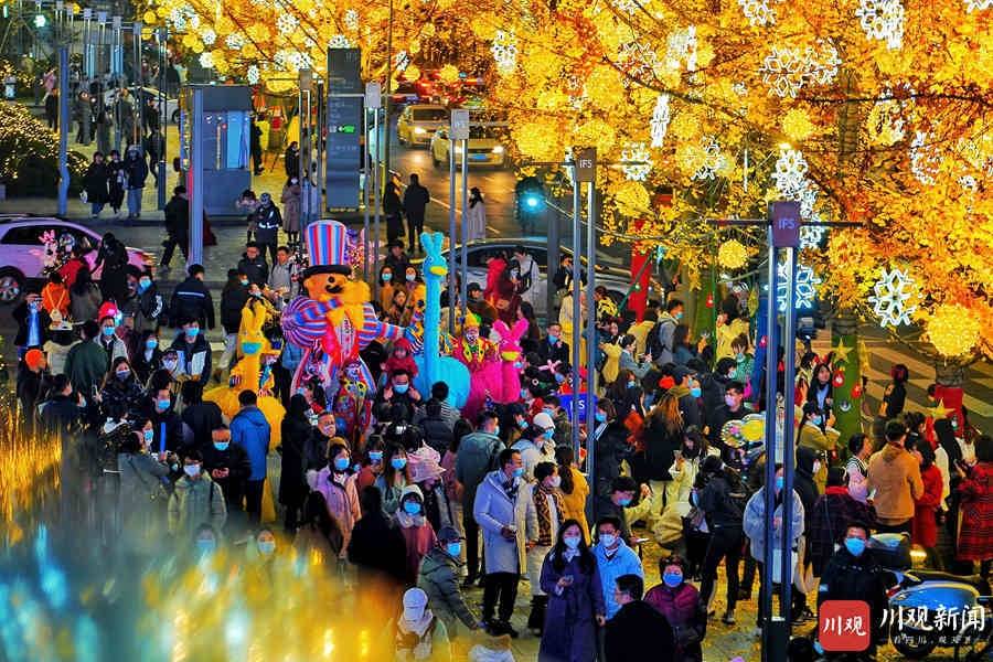12月24日平安夜,成都太古里纱帽街,沿街的银杏树挂满彩灯,如星空般的璀璨。逗趣的小丑、卡通的驼鸟线偶和氛围组嘉年华式的巡游,充满浓浓节日的气氛。
