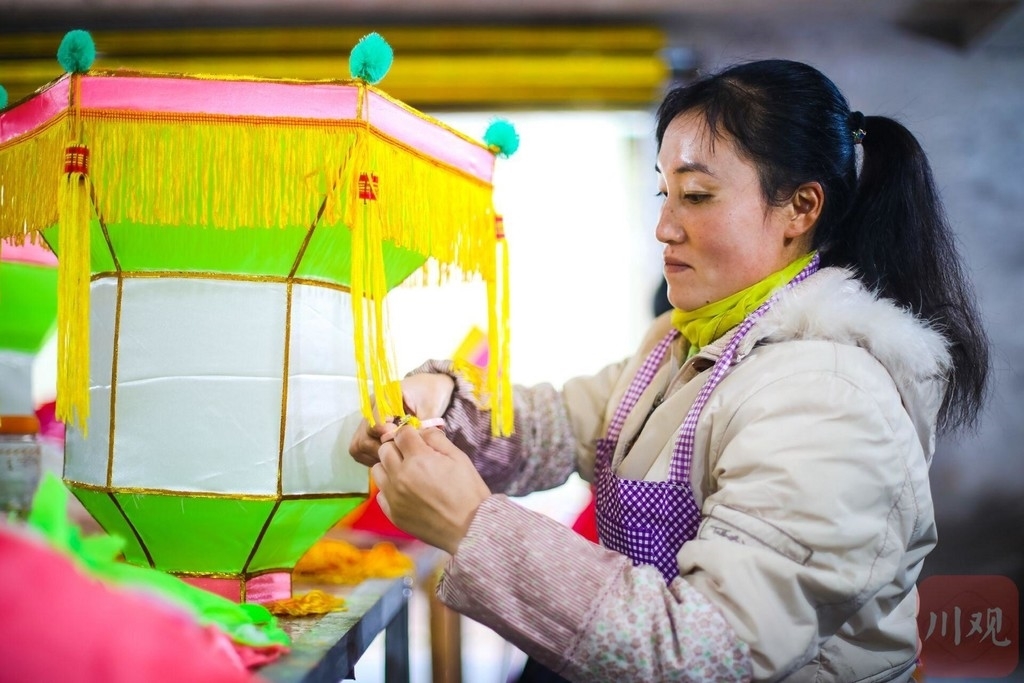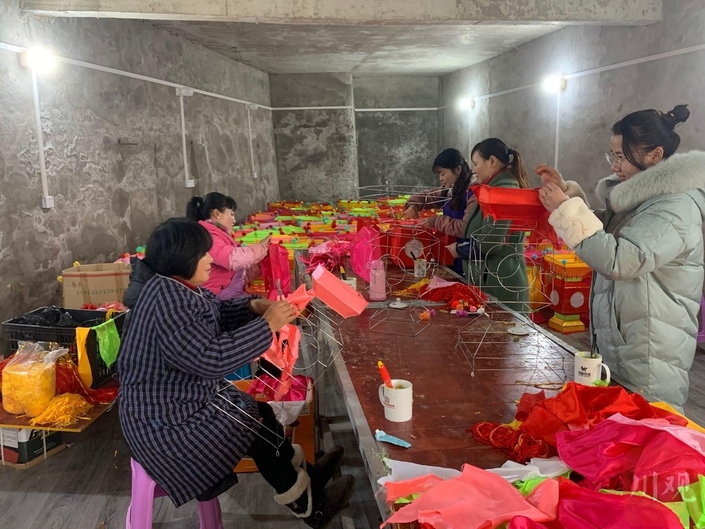 而这些漂亮的花灯并非来自外地,而是该镇鸿远村本土制造。今年9月,该村和自贡市胡氏花灯文化传播有限公司合作制灯,如今产品供不应求。