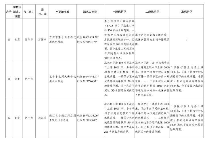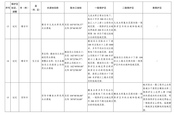 一、原则同意划定或调整划定盐边县雅砻江菩萨岩、泸州市沱江、德阳市西郊水厂应急地下水、广元市嘉陵江飞仙关、夹江县宿漕水库、峨眉山市观音岩水库、峨边县白沙河窑坪岗、岳池县嘉陵江丁家石盘、达州市石峡子水库、万源市寨子河水库、巴中市巴河大佛寺、通江县小通江河后坝里、雅安市九龙水库、宝兴县教场沟主沟高家山沟、资阳市鲤鱼水库、松潘县牟尼沟等16处集中式饮用水水源保护区,撤销峨边县白沙河麻柳湾、万源市银洞子一号、万源市银洞子二号、黑水县谷汝沟、若尔盖县热曲河流、西昌市邛海(西岸)等6处集中式饮用水水源保护区。