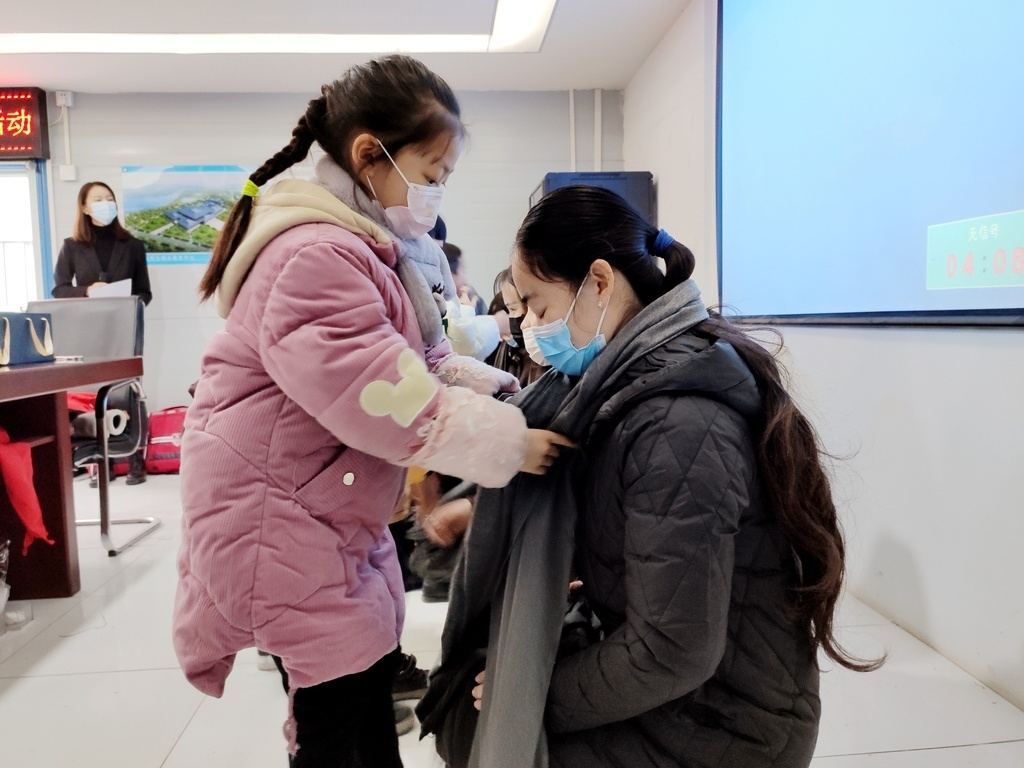 小朋友们为与会领导佩戴上红领巾,为父母戴上了代表冬日温暖的围巾,其中一名叫王东东的小朋友还激动地“啾”了一下母亲地脸庞。 活动中,项目职工志愿者为小朋友们讲解了“房子是怎么建成的”,从地基、到主体、再到封顶,一栋栋房子就是这样在父母双手中拔地而起,成为城市风景线。
