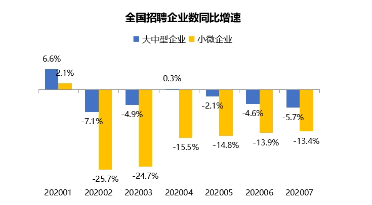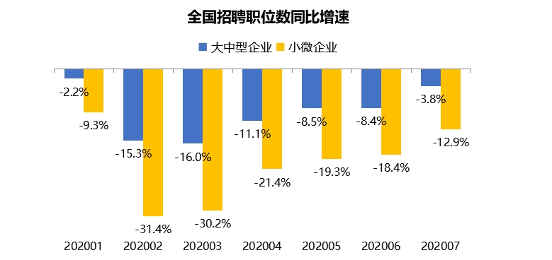 12月28日,记者从国务院发展研究中心宏观经济研究部与智联招聘联合发布《后疫情时代小微企业现状研究报告》中获悉,今年2月份以来,我国的小微企业招聘需求同比下降幅度最为明显,招聘企业数、招聘职位数分别同比下降25.7%、31.4%。随着疫情好转,招聘企业数和招聘职位数同比下降幅度逐步收窄,但仍然低于去年同期。