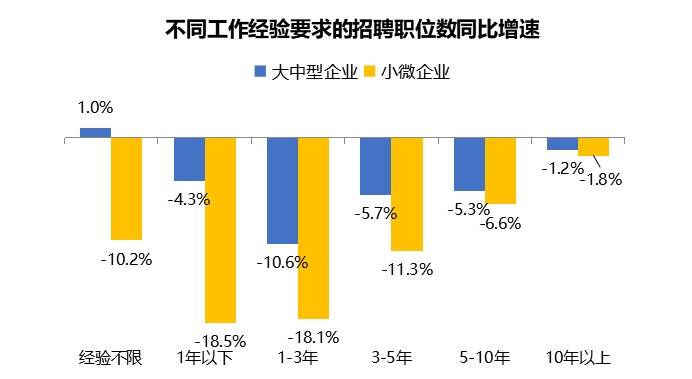 从小微企业对应聘人员的工作年限看,对经验要求不高的职位数量同比降幅更为明显。要求有1年或者1-3年工作经验的小微企业职位,同比降幅分别为18.5%、18.1%;相应要求的大中企业职位同比降幅分别为4.3%和10.6%。对更为熟练员工的需求降幅较小,要求有5-10年工作经验与10年以上工作经验的小微企业职位分别同比下降6.6%、1.8%,而相应要求的大中企业职位同比降幅分别为5.3%、1.2%。